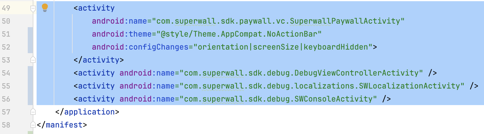 <activity android:name="com.superwall.sdk.debug.DebugViewActivity" />