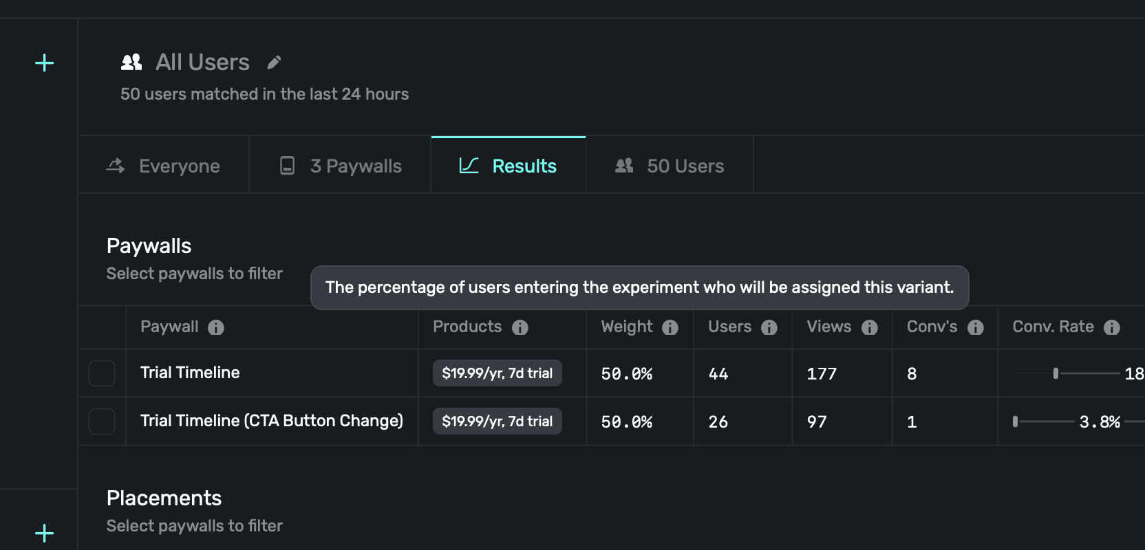 Here, you'll see each paywall being used (or that was used) in an experiment. Superwall will show you metrics such as proceeds, users and much more. There are several metric to explore, and you can hover over any of them to get more details about what each metric represents: