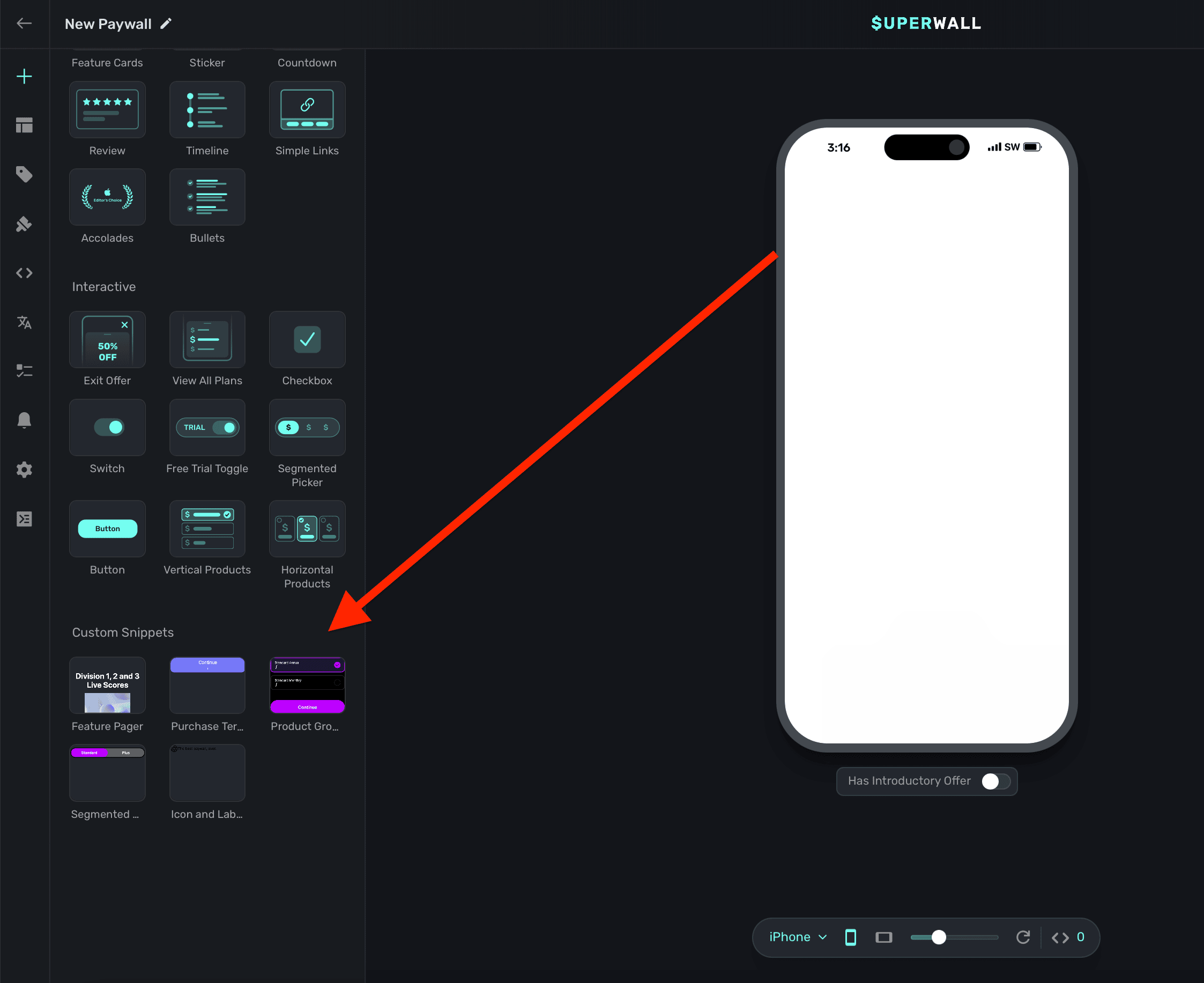 Click the + in the left sidebar or in the Layout tab to select an element to add to your paywall. This will present our library of components along with any snippets you've made (along with some of our own stock recipes):