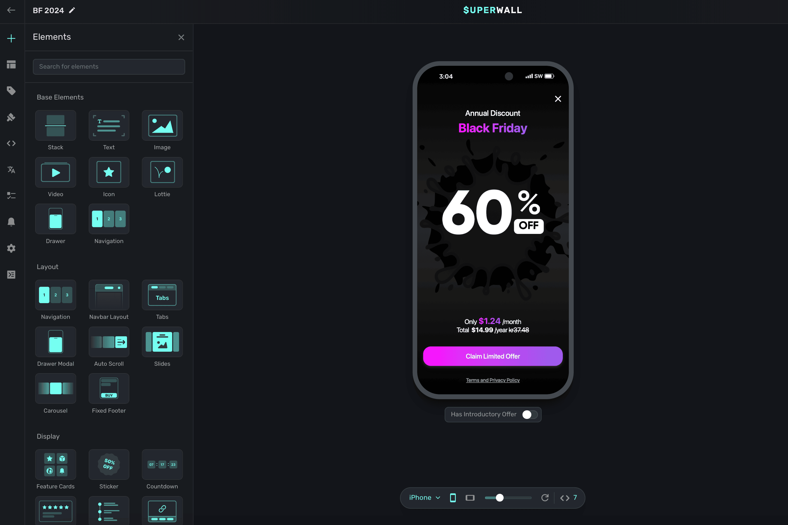 The Layout tab in the sidebar provides a visual outline of your paywall's components. Hovering over elements will highlight them in the device preview: