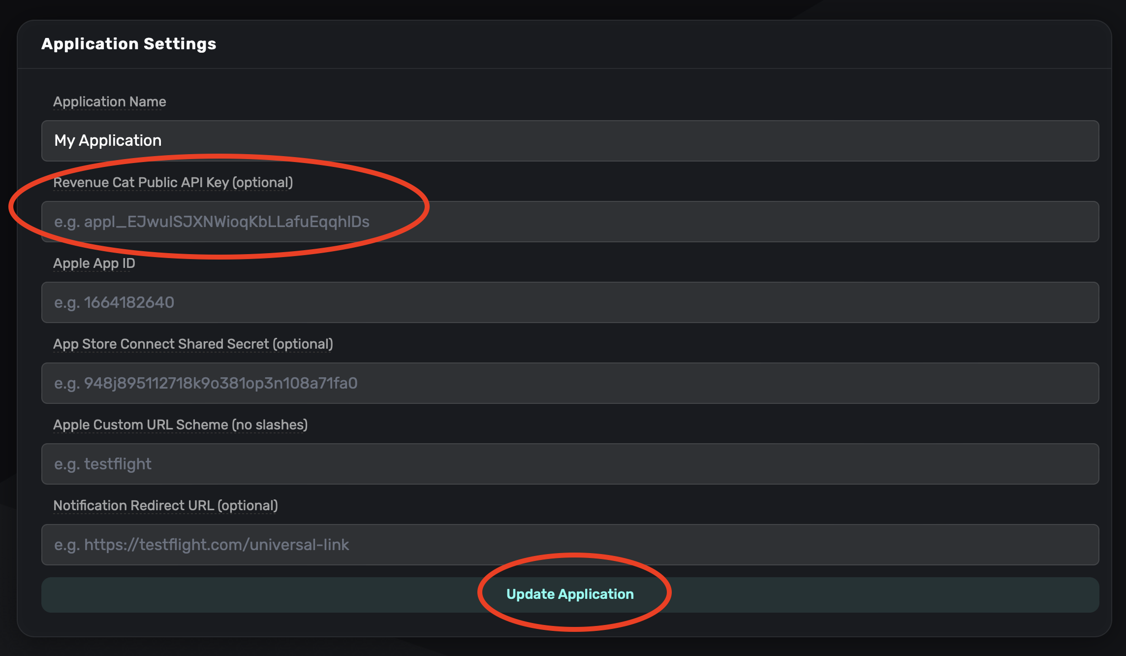 Then, add your RevenueCat Public API Key inside of settings by clicking the cog wheel icon in the navigation bar from any page and selecting Settings. Paste your API key then click Update Application: