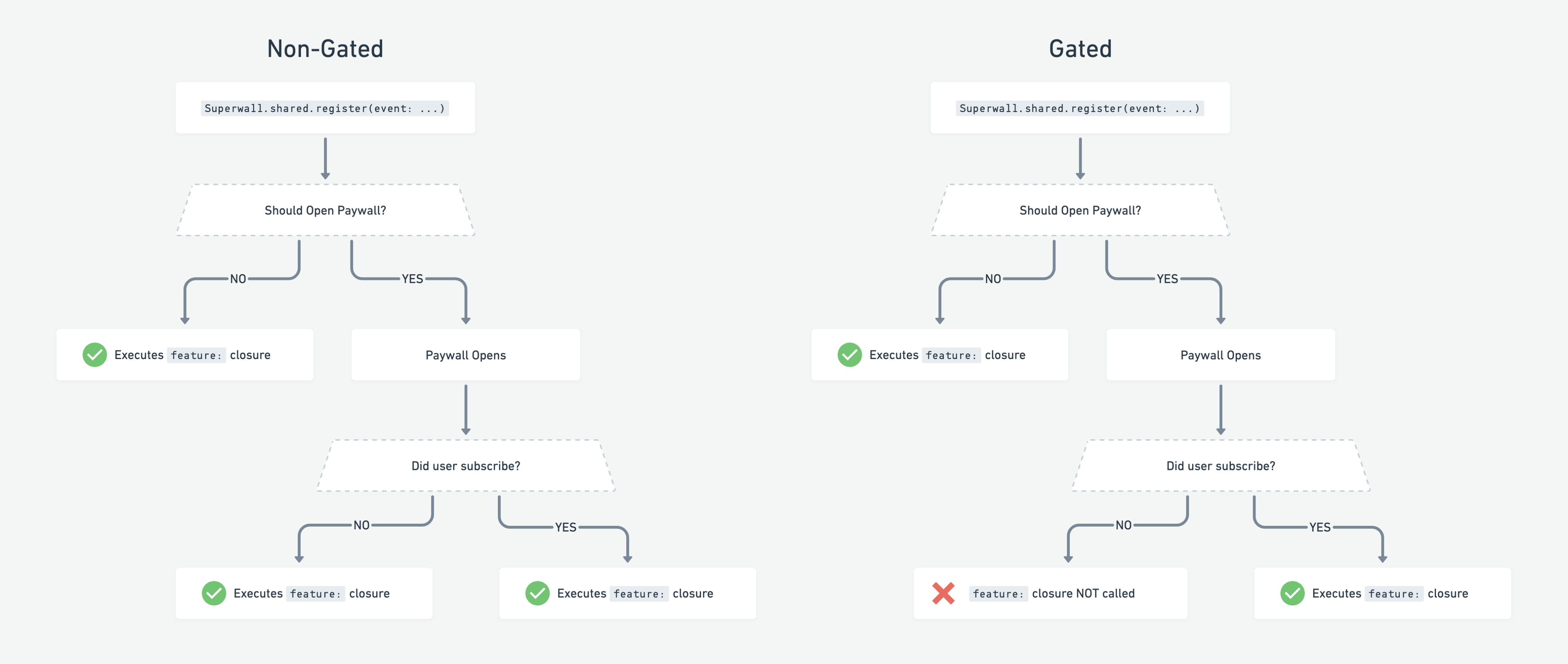 feature:closure onregister(event: ...)gets called when the paywall is dismissed (whether they paid or not) - If the paywall is set to Gated, the