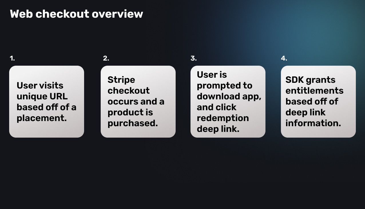 Superwall's web checkout integration makes it easy to set up purchasing funnels for your app via the web. Web checkout is powered by Stripe. Once an online purchase is complete, the customer will be redirected back to your app with a deep link that can be used to unlock content or features in your app via any associated entitlement.
